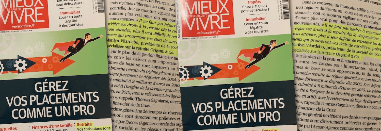 Origami&Co est cité dans le numéro de Septembre de "Mieux vivre votre argent" ! Dans le dossier Comment muscler votre future pension retraite ?, retrouvez page 34 la citation de Marilyn Vilardebo, dirigeante d'Origami&Co. [av_button label='Lire en ligne' link='manually,https://www.origami-co.fr/wp-content/uploads/2020/09/Article.pdf' link_target='_blank' size='medium' position='center' icon_select='no' icon='ue800' font='entypo-fontello' color='theme-color' custom_bg='#444444' custom_font='#ffffff' custom_class='' admin_preview_bg='' [...]